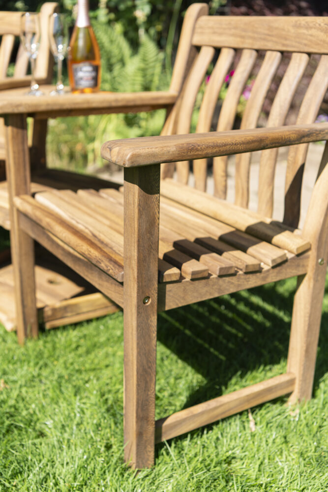 The benches are made from Dark Acacia which is a dense and durable hardwood, also known as Pheasant wood. It has exotic grain patterns, making each piece unique and extremely eye catching. Understandably, your friends may expect to be entertained with a banquet!